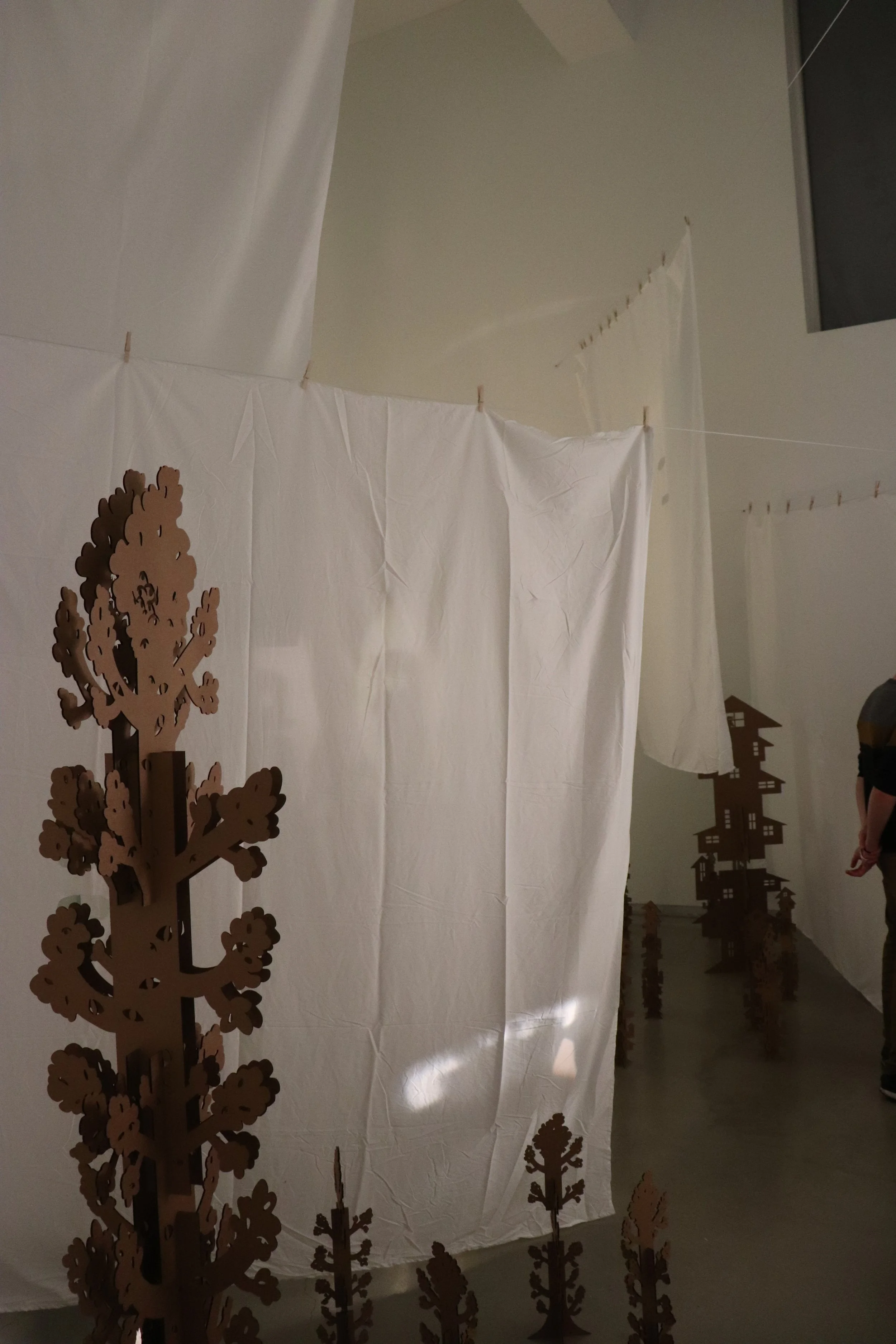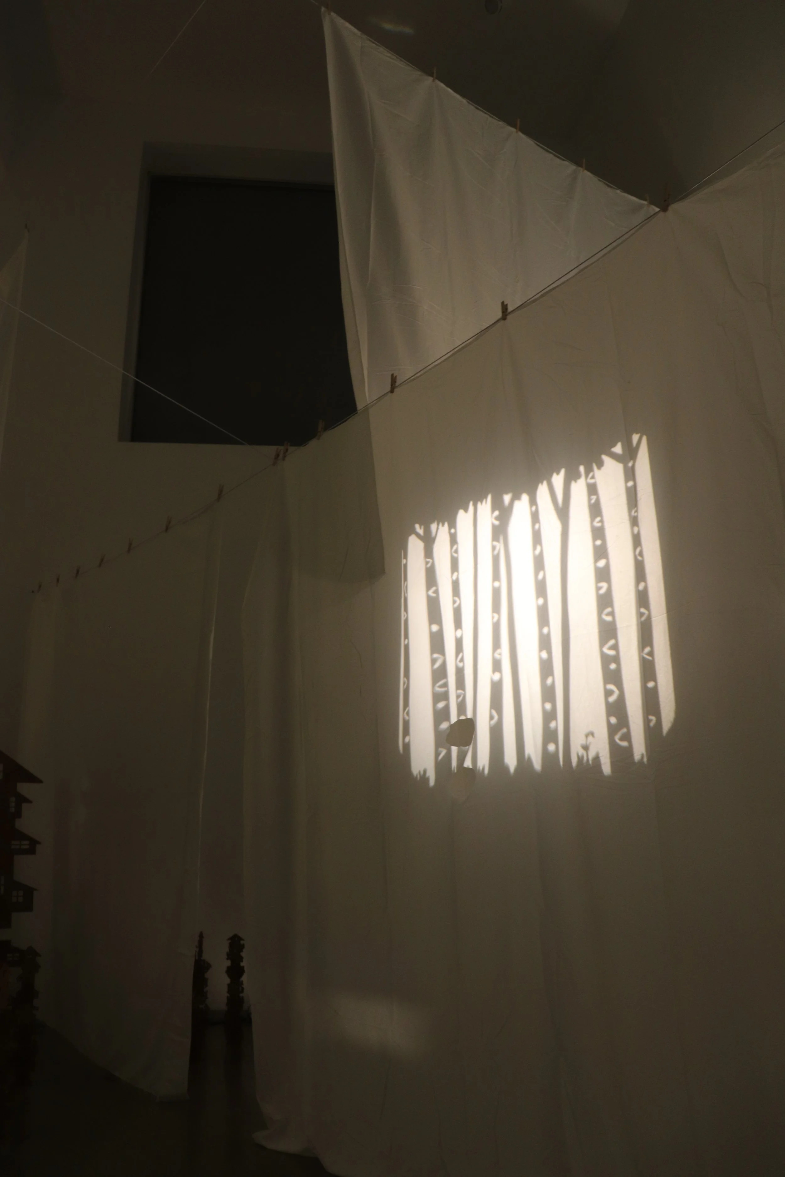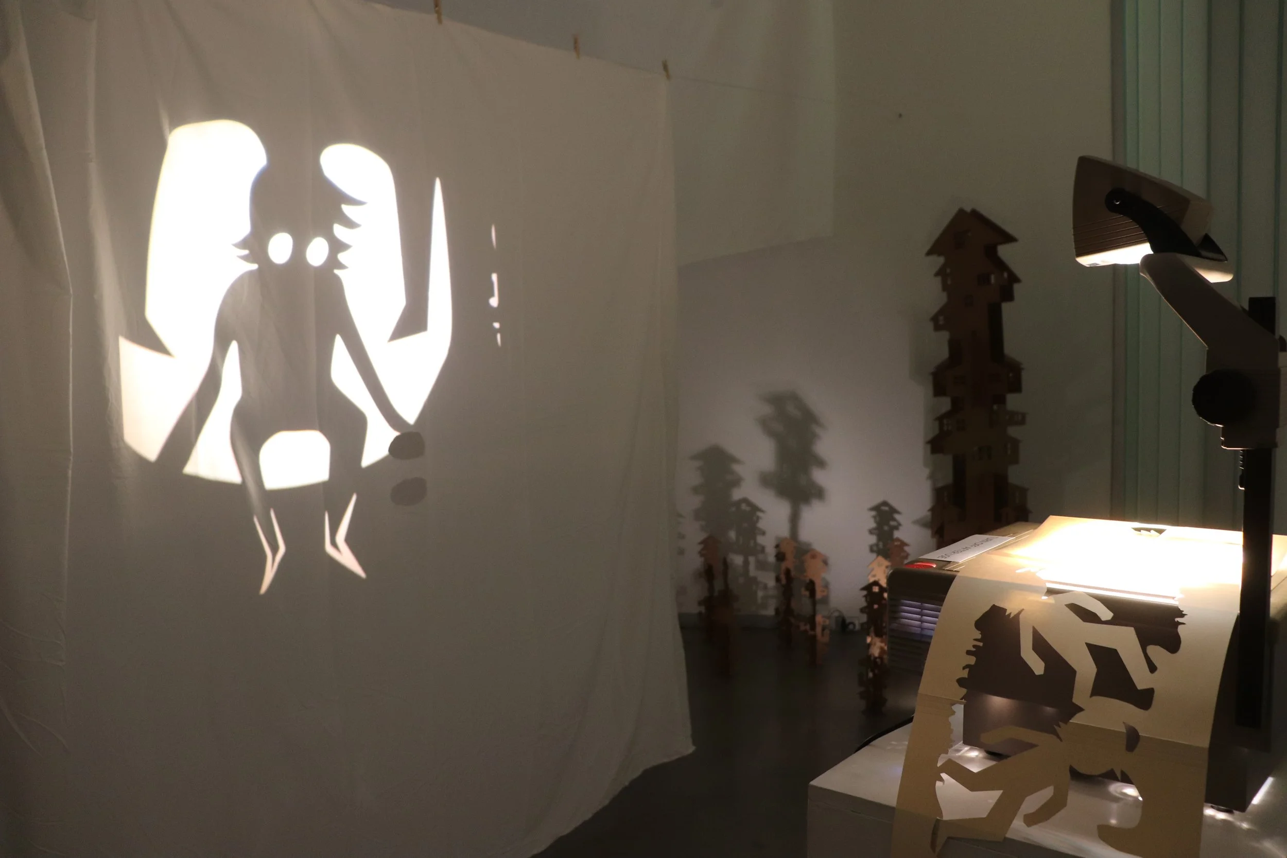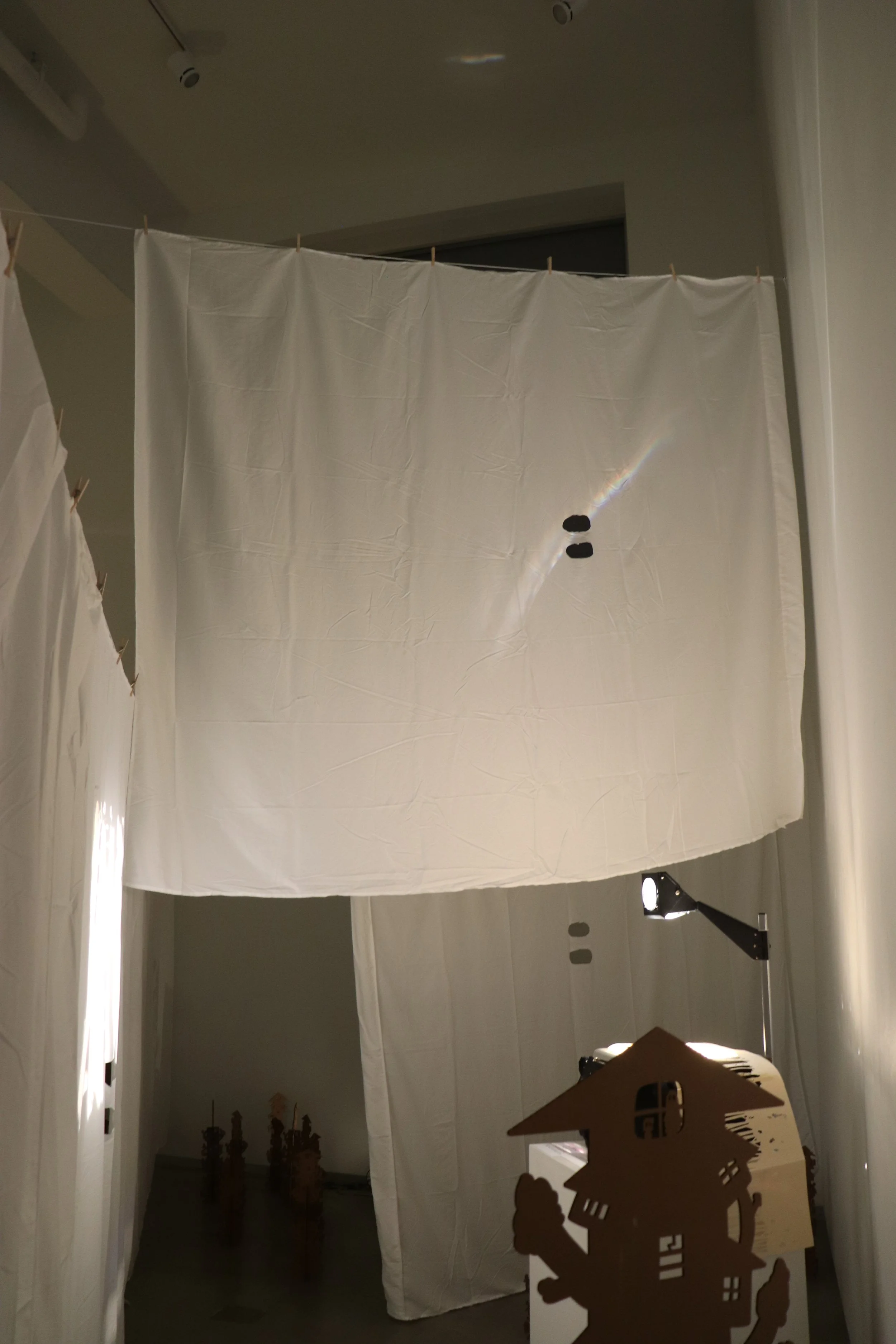Somewhere, Not Here is an installation that explores a narrative rooted in the in-betweens. The exhibition acts as a rendering of liminal space through a setting experienced in light and shadow. Illustrative sculptures, bedsheet ghosts and shadow-puppetry show fractures of a story with an overarching theme rooted in the threshold of intermediacy. The environment is manipulated to support a narrative display that allows for varying interpretations by those who inhabit it.